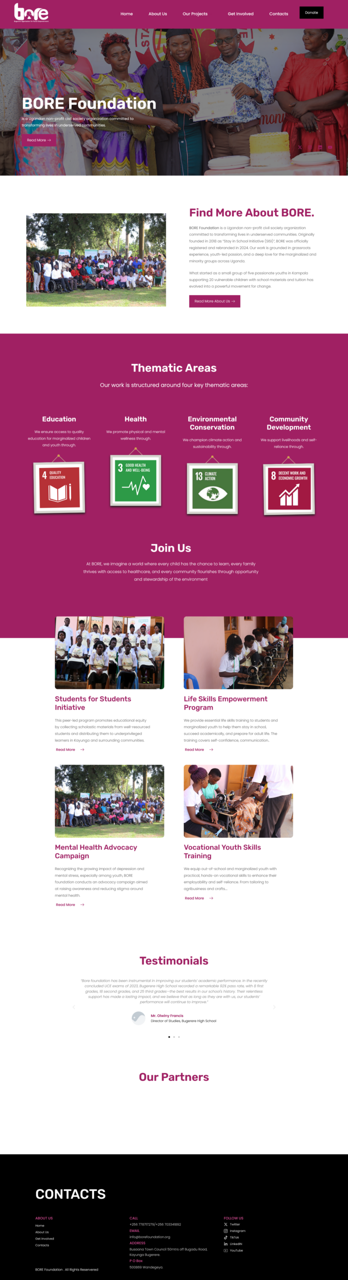 To give BORE Foundation a credible, accessible web presence so that stakeholders (donors, partners, volunteers) can understand its mission, programs, and impact.